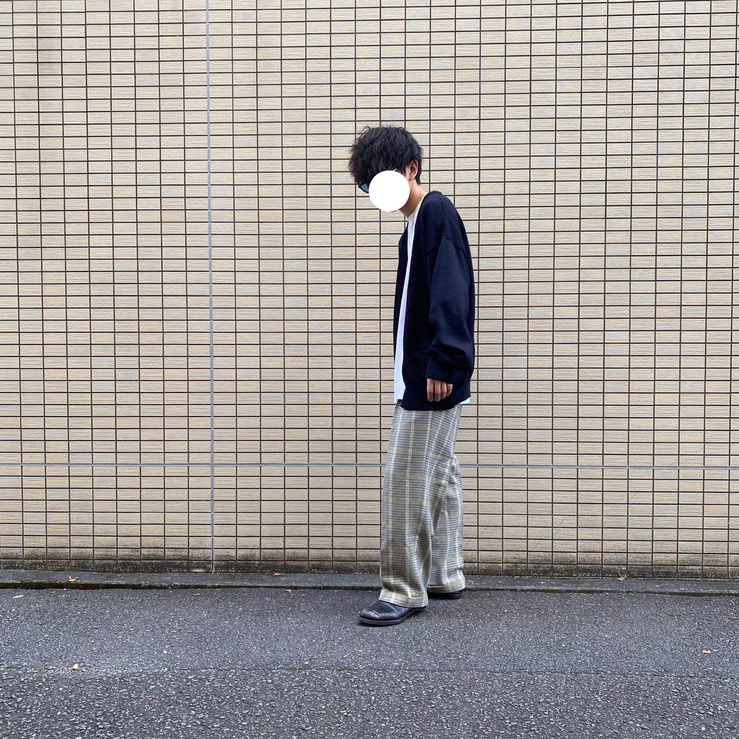 チェック柄のパンツは形がストレートで綺麗です。見えにくいところですがやや汚れありです。濃紺のカーディガンはベーシックなデザインでどんなアイテムとも合わせやすく、1枚あると着まわしがききますよ!