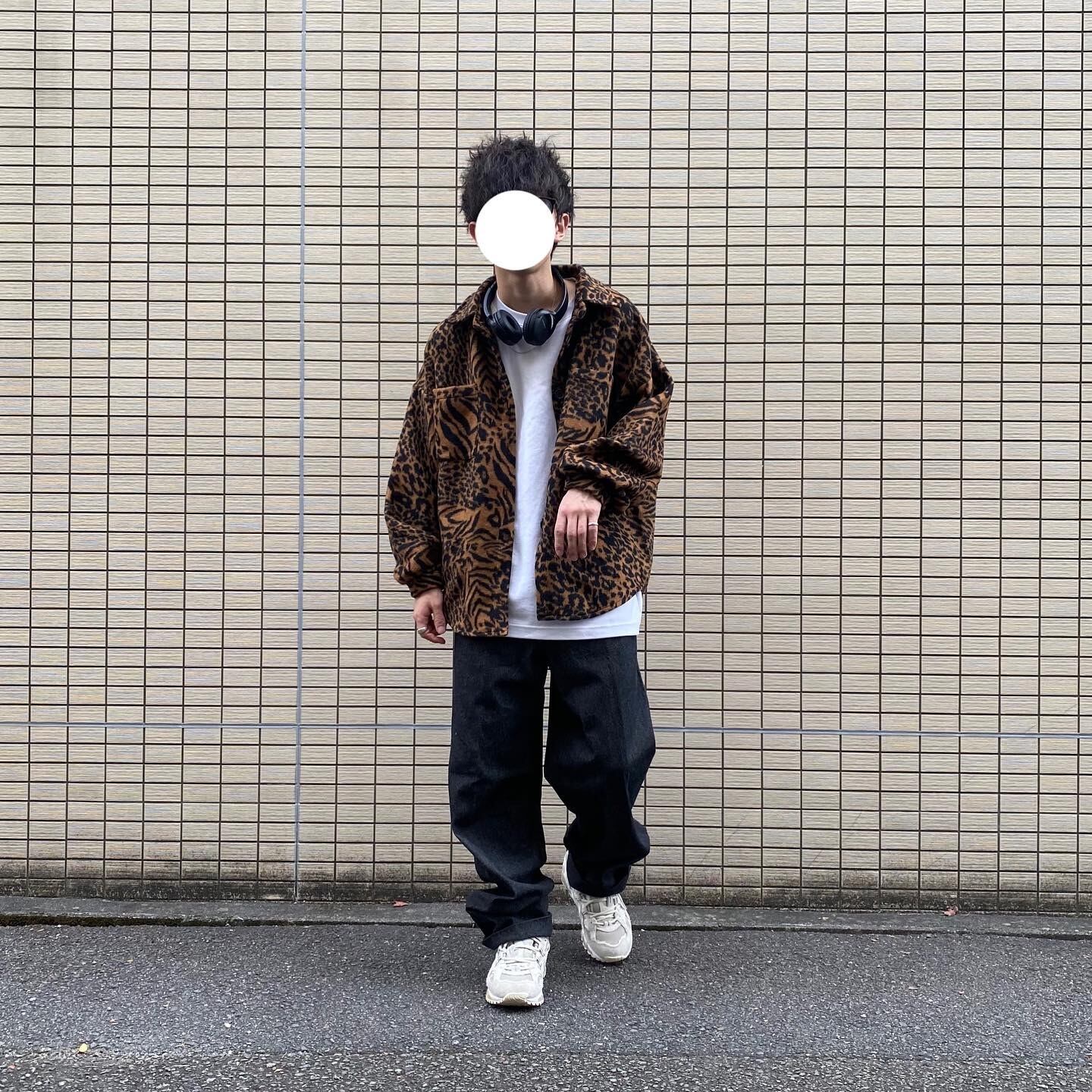 目を惹くレオパード柄のジャケットはオーバーサイズでかなりいかつくカッコイイデザインになっております!太めな黒のデニムを合わせて秋冬にもってこいのコーディネートになりました!