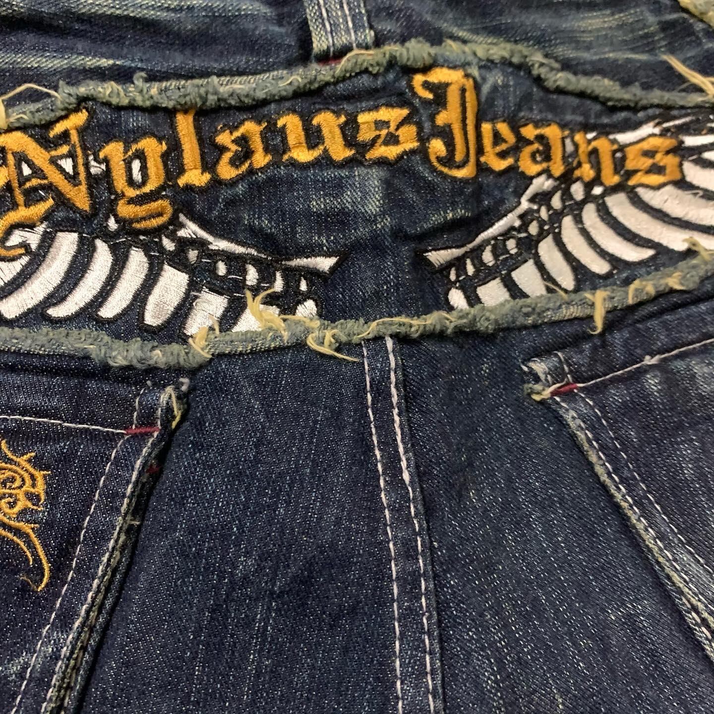 なかなか出会えないめちゃくちゃ渋いフレアデニムで、お尻のところに写真のようや刺繍ワッペンがあり、ばちばちに渋いです。ケミカルウォッシュ具合も最高で、ジャケットのレザーもブラウンのオーバーなシルエットと相性最高です