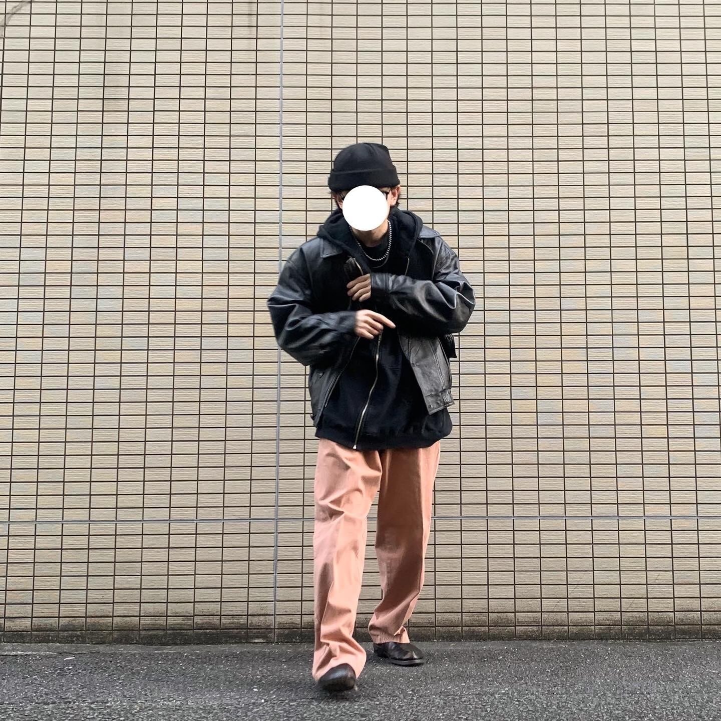 レザーだけだと男臭い印象になるのでパンツに差し色でピンクを入れてみました!ただのアウターにピンクだと可愛らしさが勝ちますがかっこいいレザーに合わせることで中和しておしゃれな印象になります!