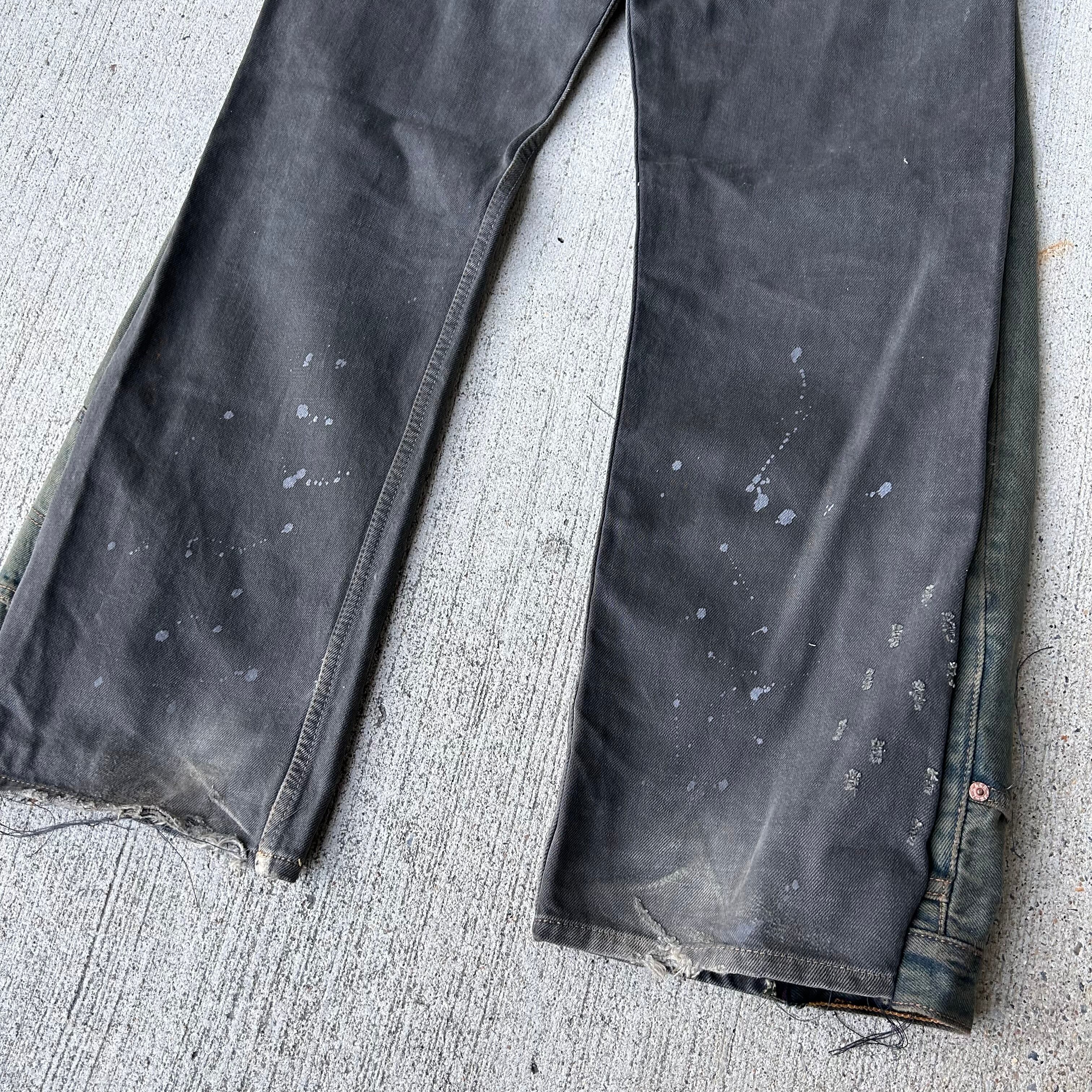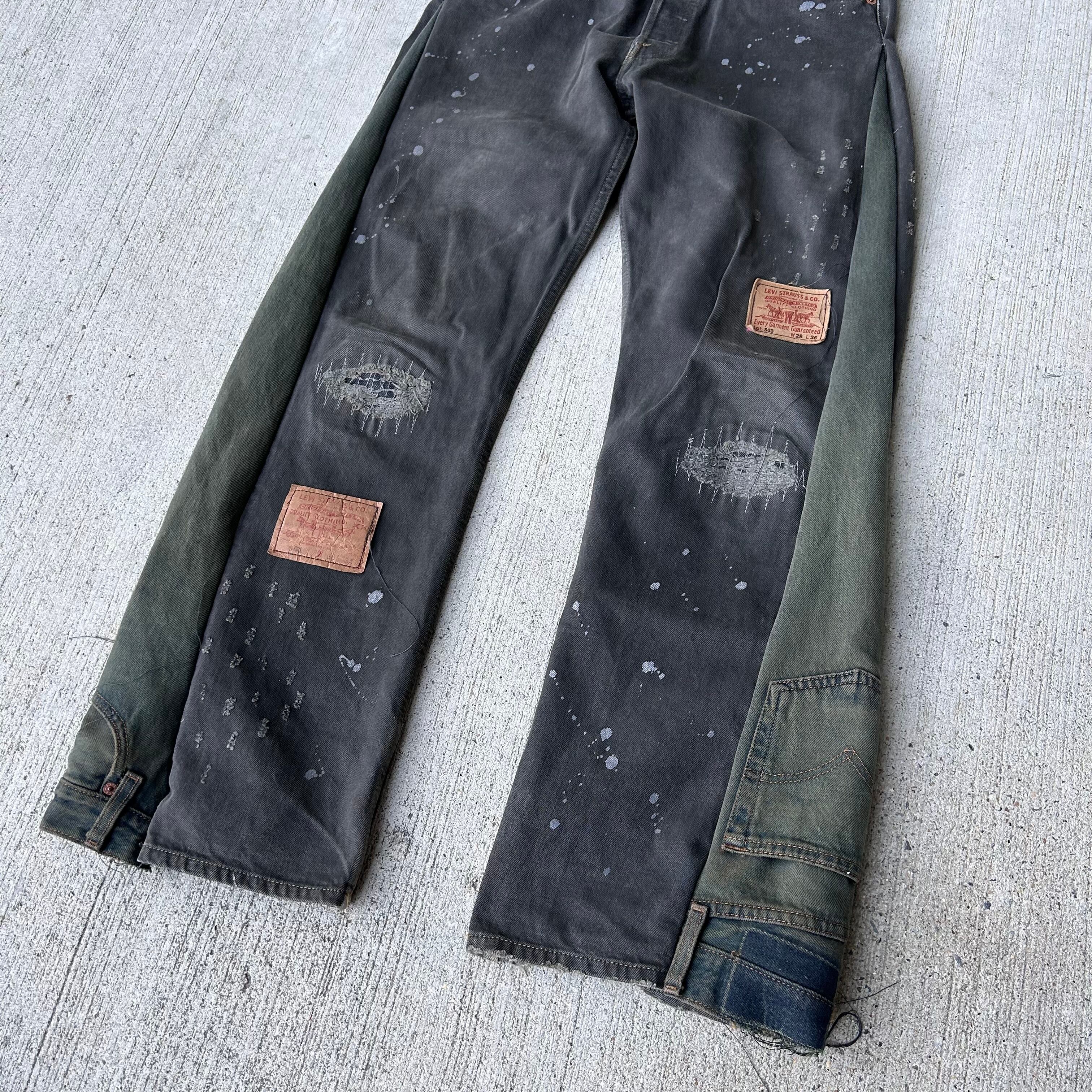 グリーンの色落ちリーバイスと色味と加工が鬼渋のリーバイスブラックデニムのドッキングパンツ