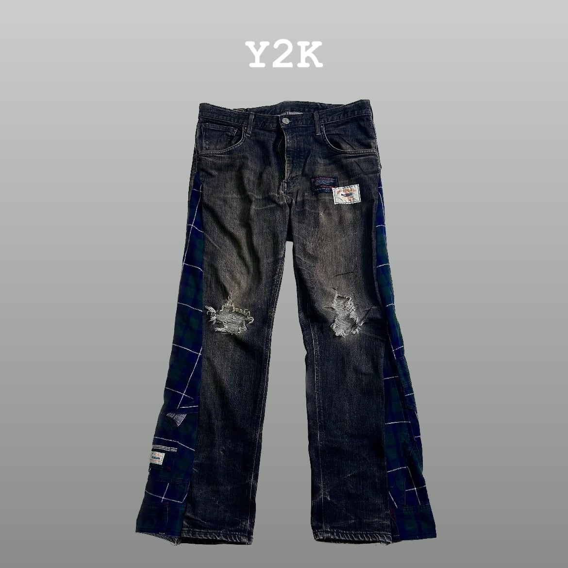 鬼渋 グランジリメイク チェックドッキング シンチバック Y2K ブラックデニム