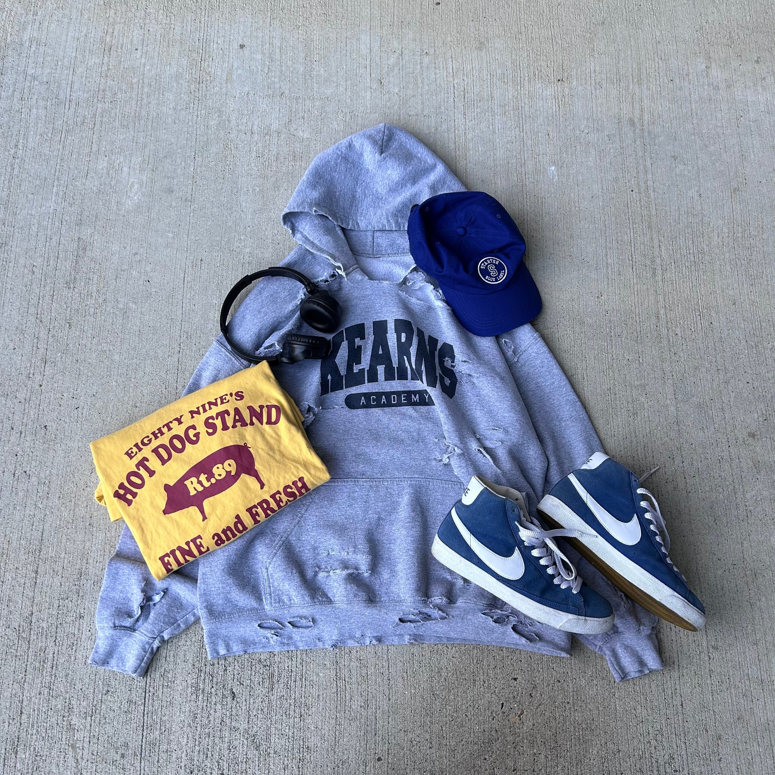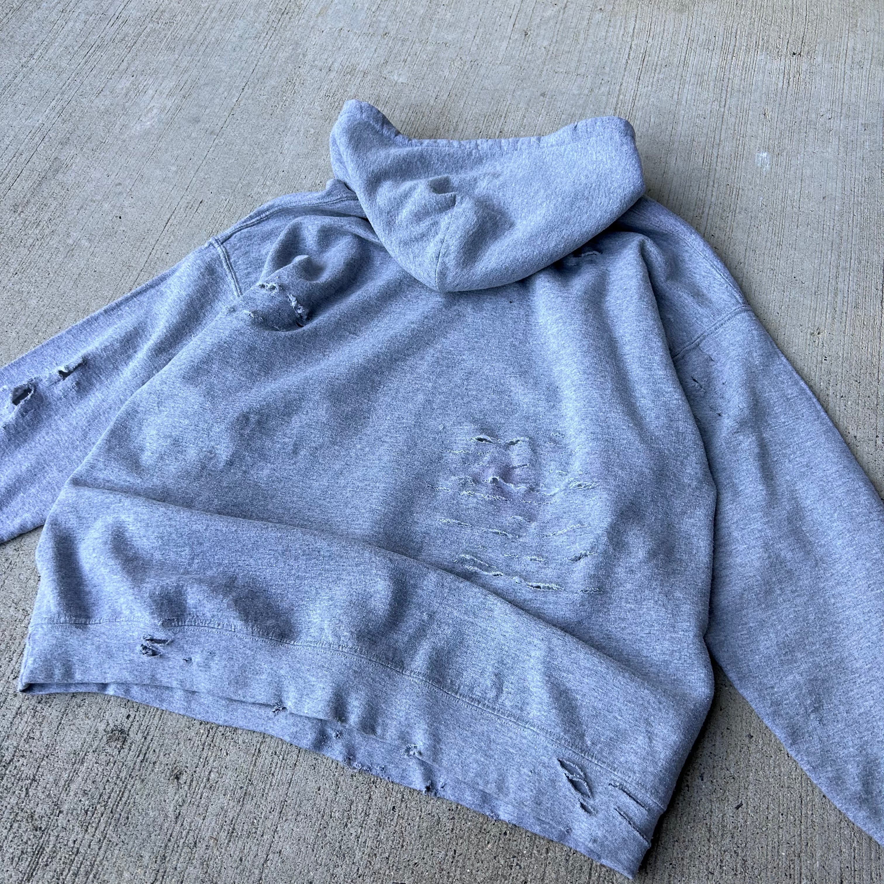 カレッジデザインのオーバーなフーディをボロ加工にしています!手洗い推奨