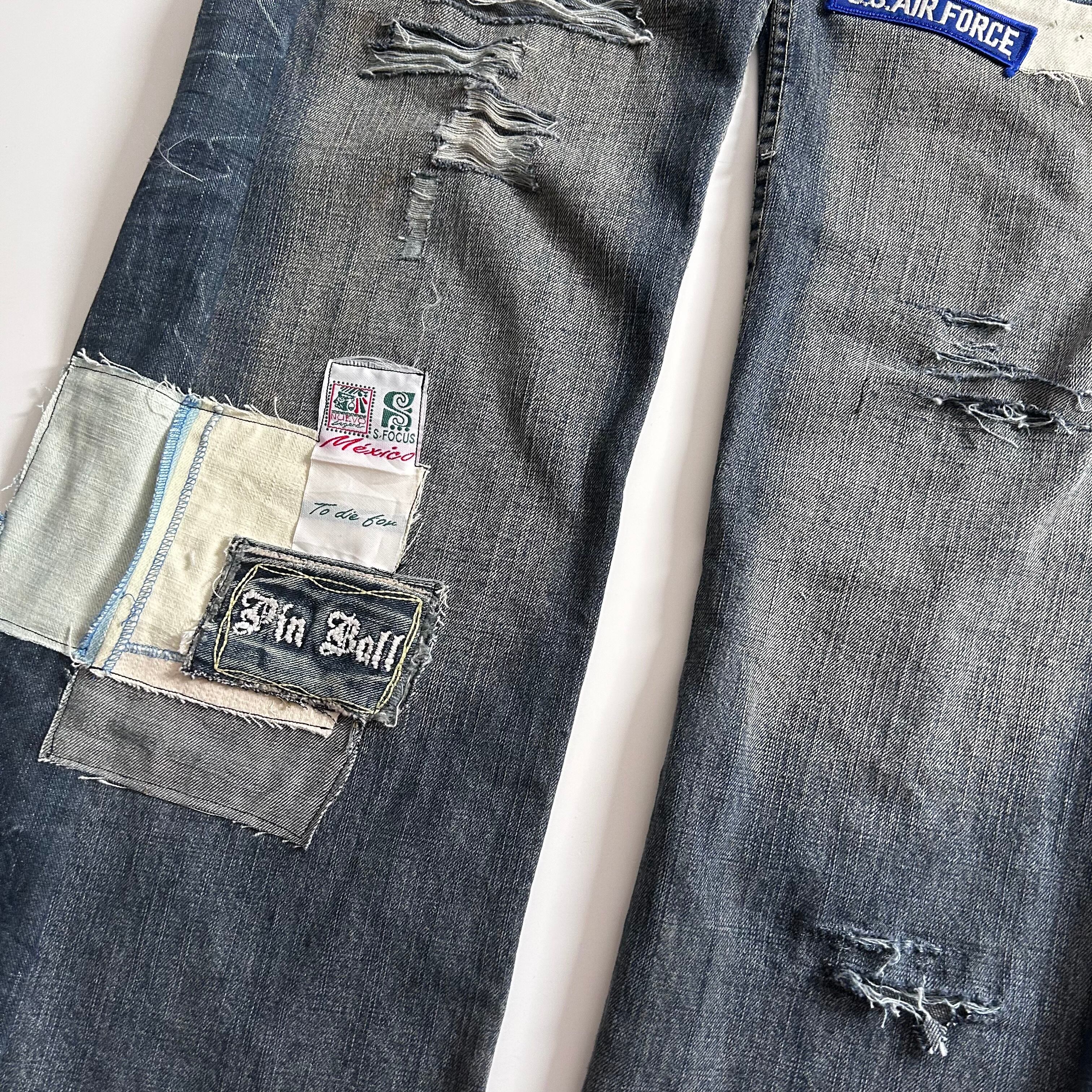 鬼渋 ドッキングワイドフレアデニム パッチワーク ダメージ加工 グランジ Y2K 極太 国旗