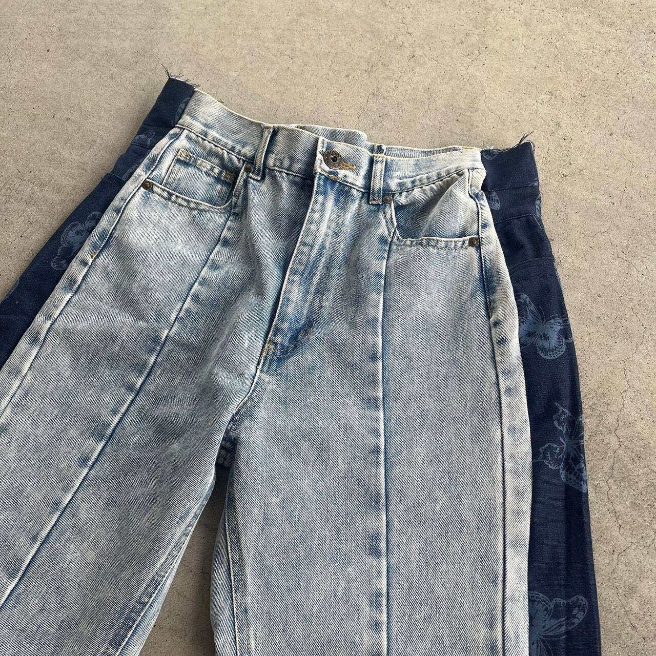 バタフライ柄をサイドにドッキングしたワイドなシルエットのフレアデニム