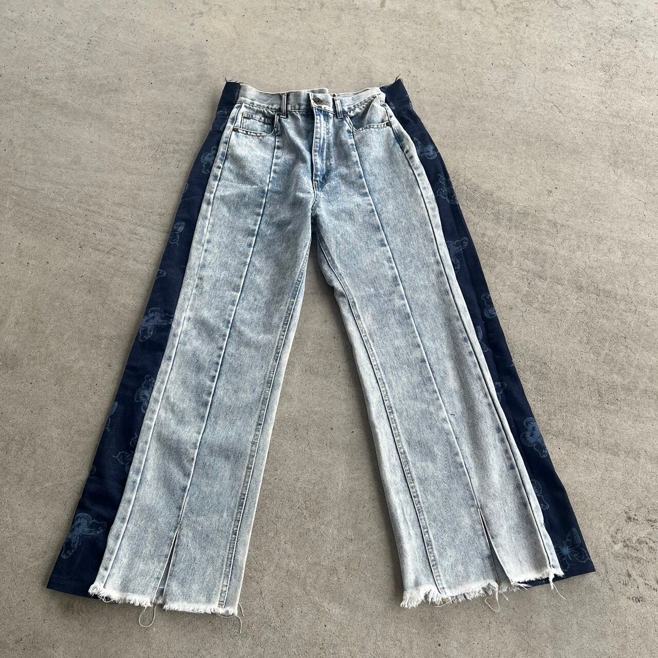 ドッキング リメイクスリッドフレアデニム センタースリッド バタフライ柄 編み込むデザイン