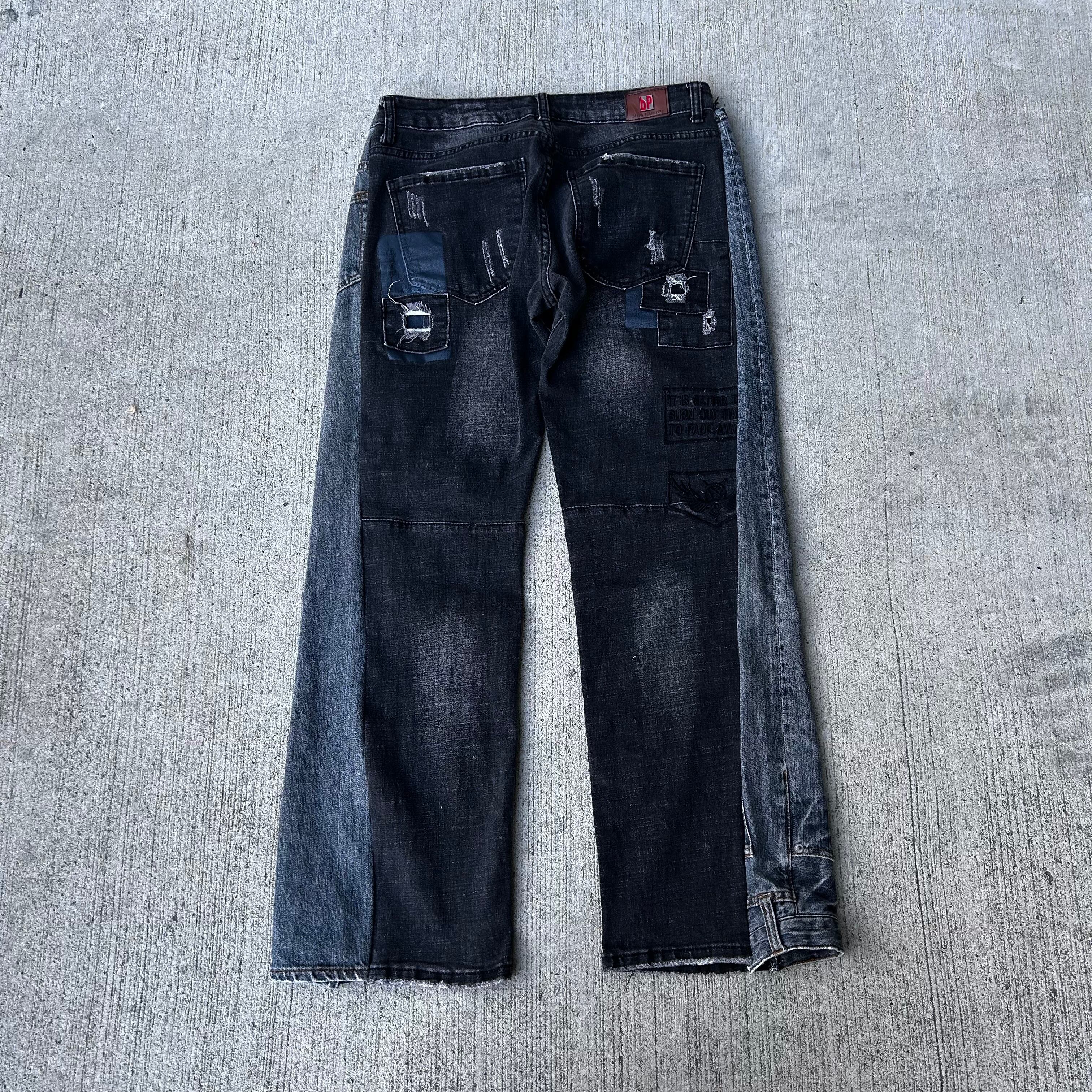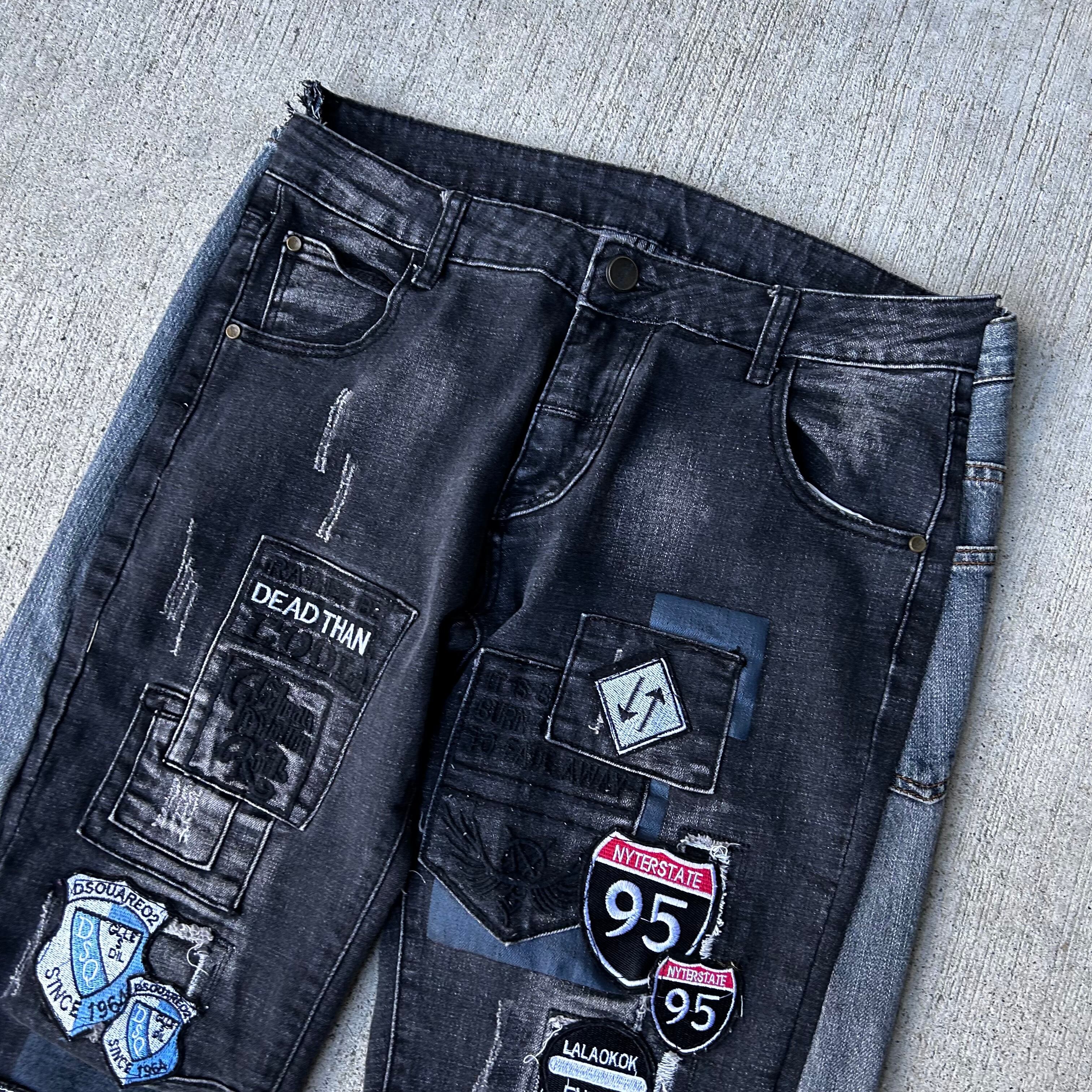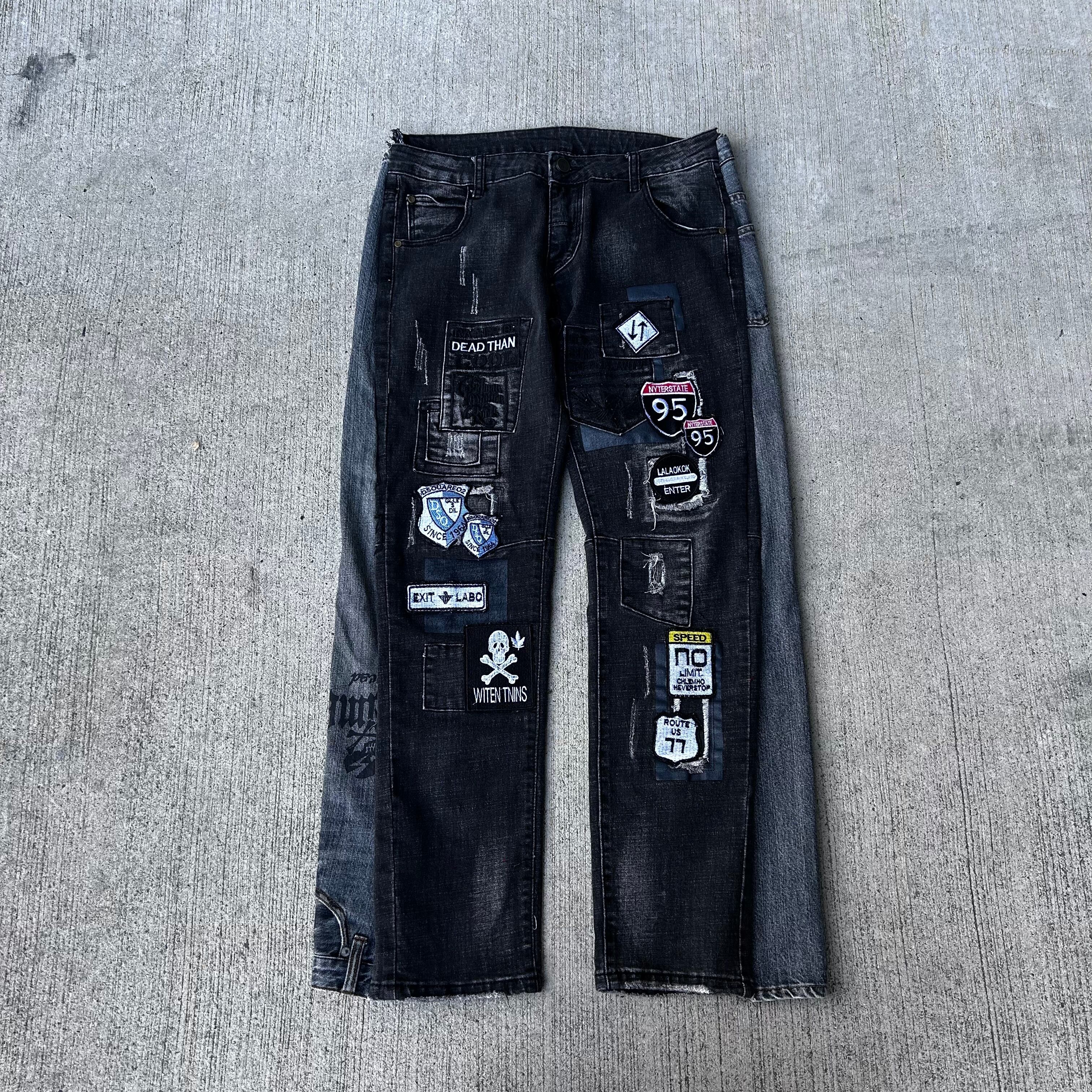 Used オリジナルリメイク ドッキング ダメージストレートデニム ブラックデニム ワイドストレートシルエット ワッペン ダメージ加工