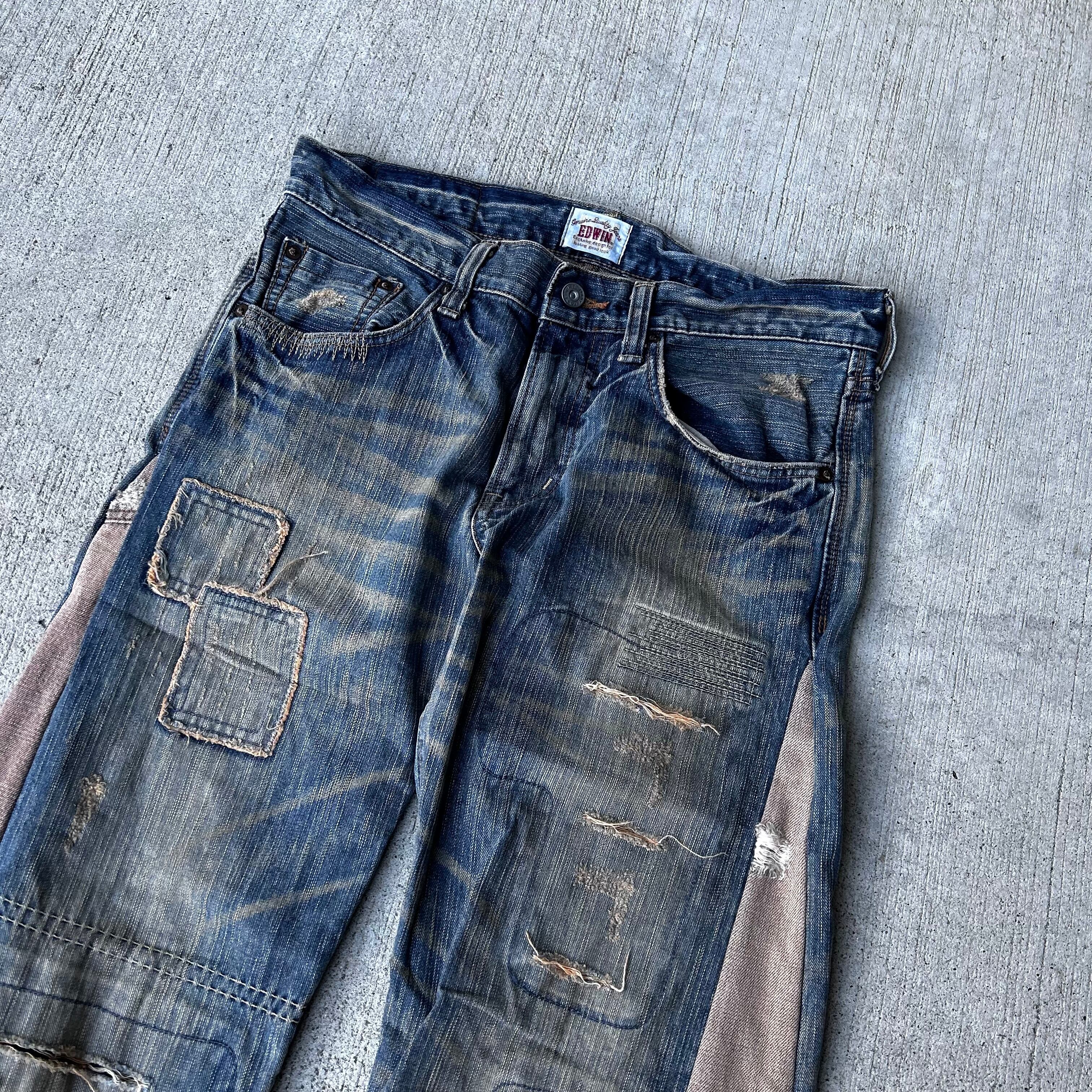 Used オリジナルリメイク ドッキング ダメージフレアデニム ブラウン パッチワーク ヴィンテージ加工 oldデザイン 鬼渋