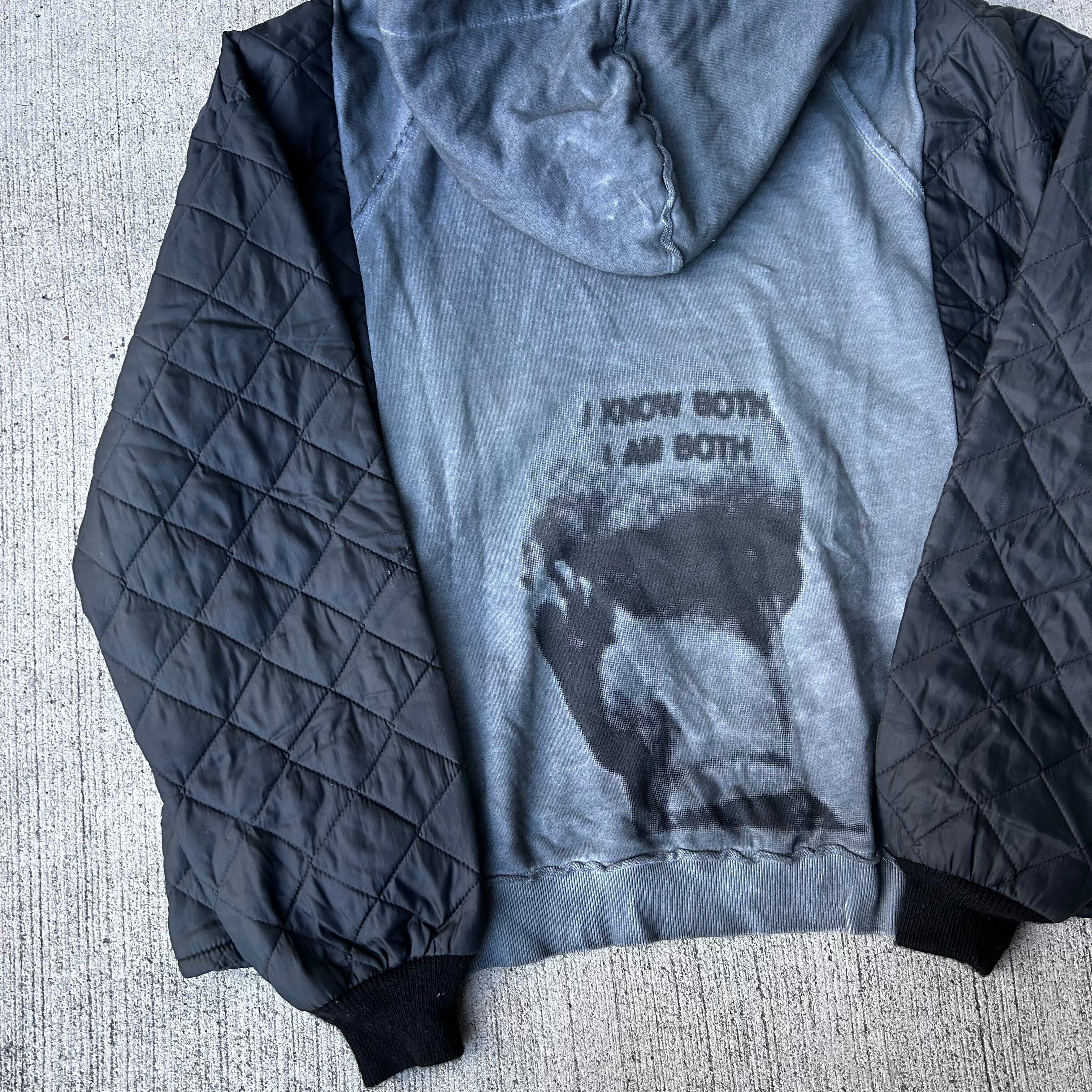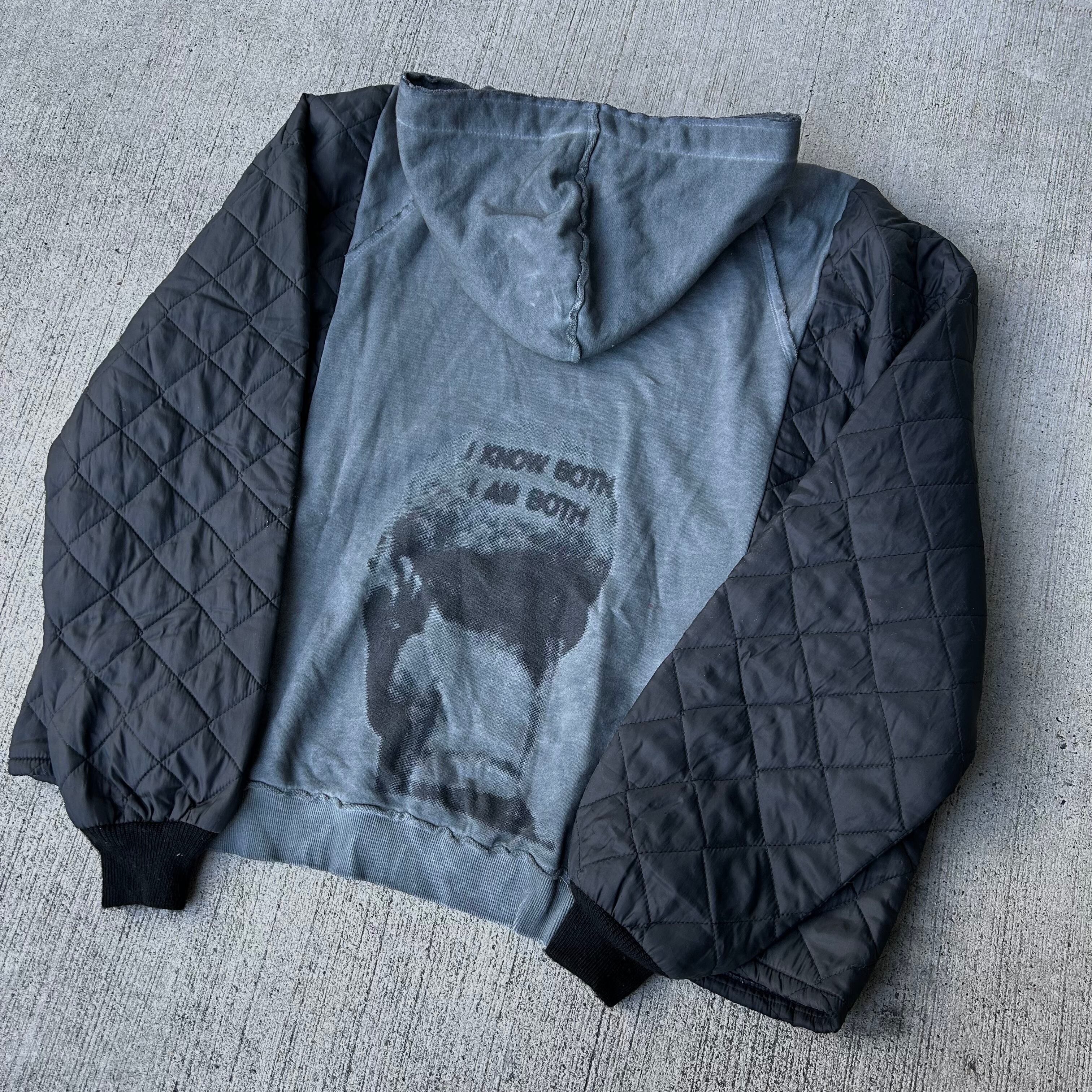 Used オリジナルリメイク キルティングドッキングフーディ 鬼渋 グレー ドッキング リメイク バックプリント