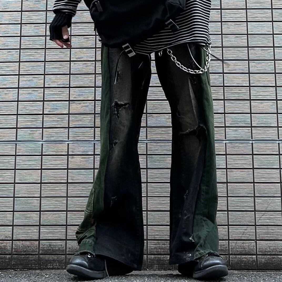 Pants 再構築 サイドアシンメトリーフレアデニム ドッキングデニム ダメージ加工