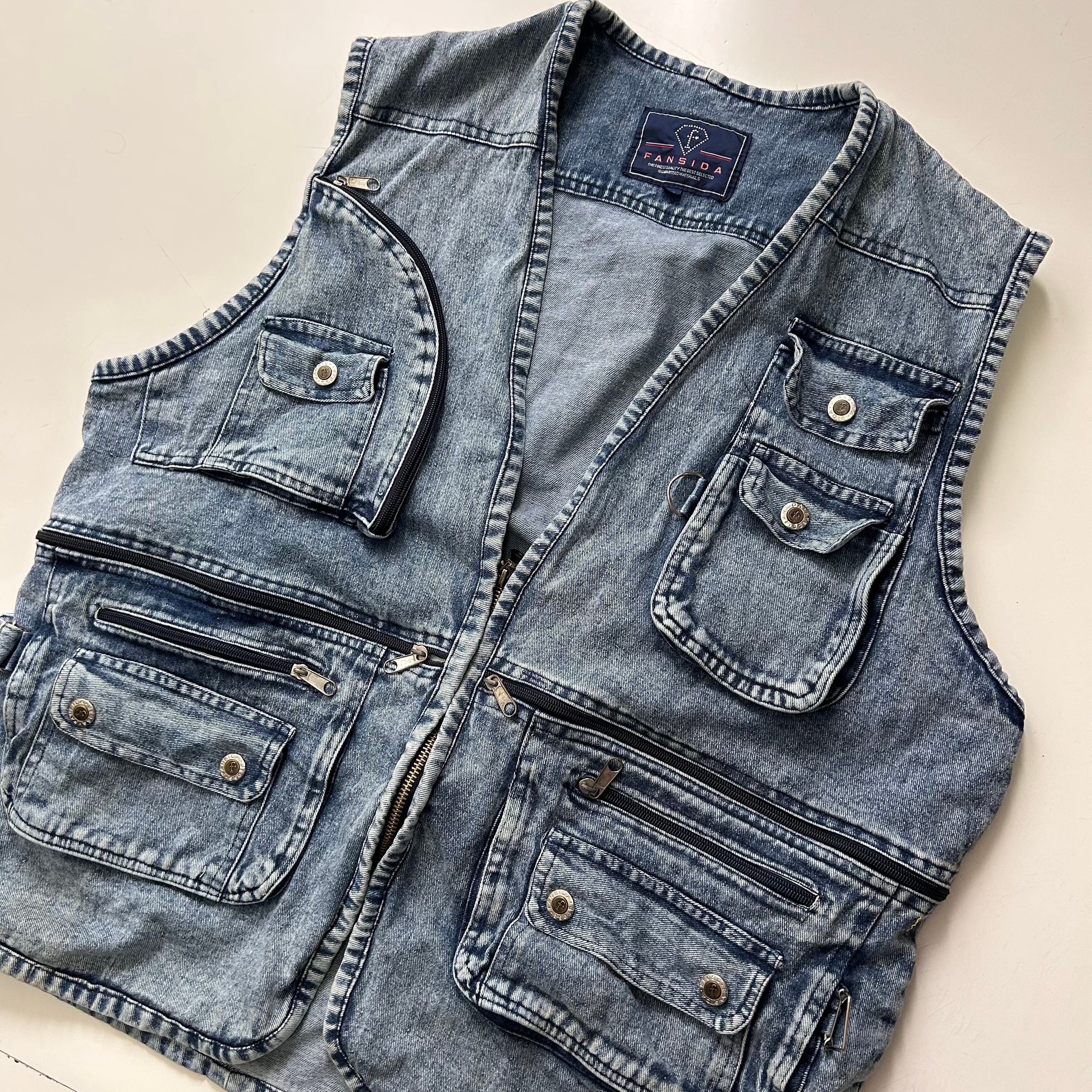 Y2K デニムフィッシングベスト 3Dポケット zipデザイン ベスト デニム