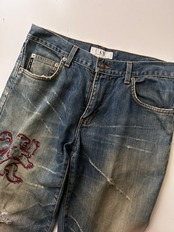 ARMANIのストレートデニムに、ダメージ加工が施されたアイテムが登場しました。飽きのこないデザインと、リアルでクールな風合いが特徴です。膝かけてのダメージ加工が入っており、程よいヴィンテージ感を演出しています。引っ掻いた跡のような傷のダメージ加工がデニムのアクセントになっています。アニマル柄刺繍もかなり良いアクセントです