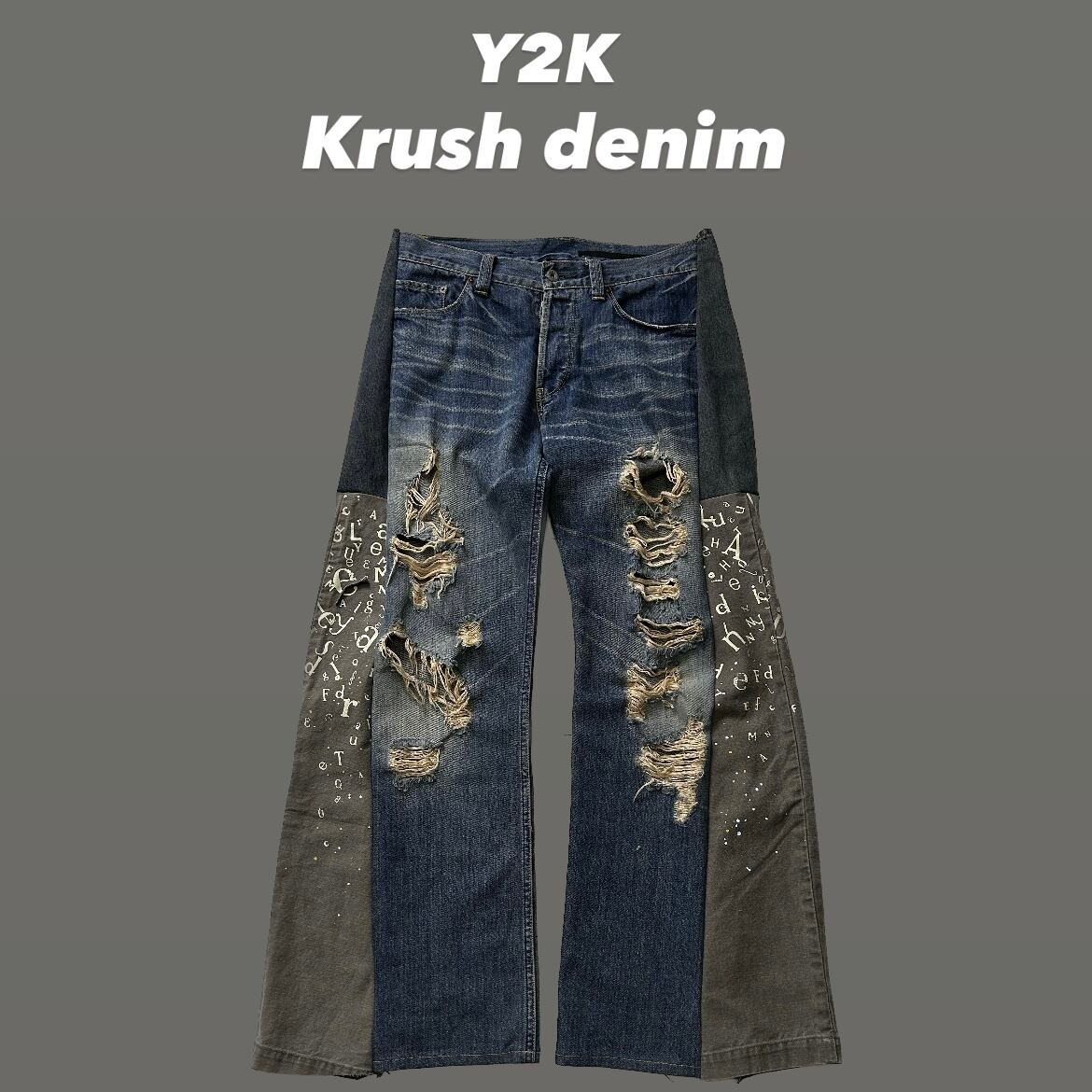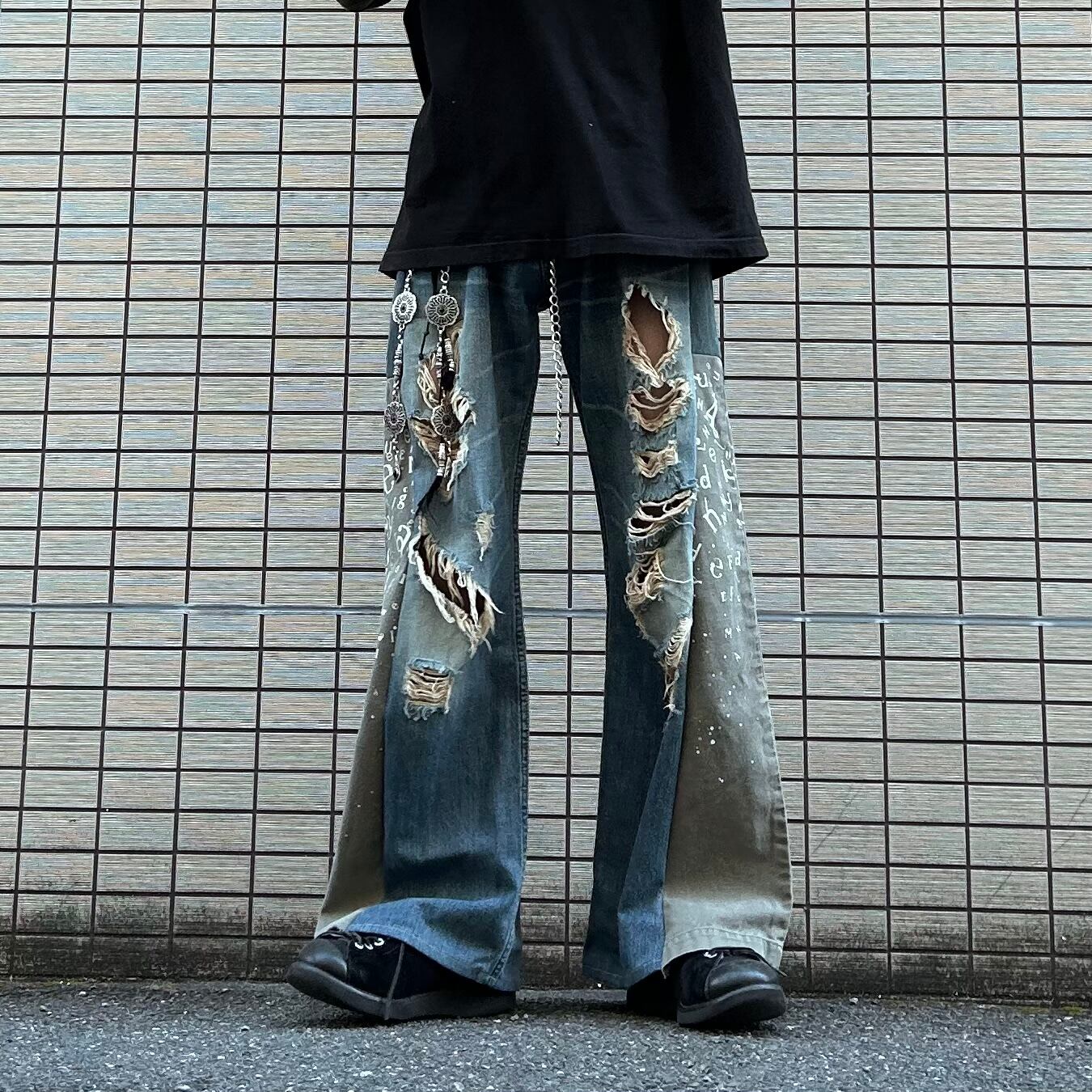 再構築 Y2K グランジ クラッシュデニム 英文字 アルファベット柄 フレア