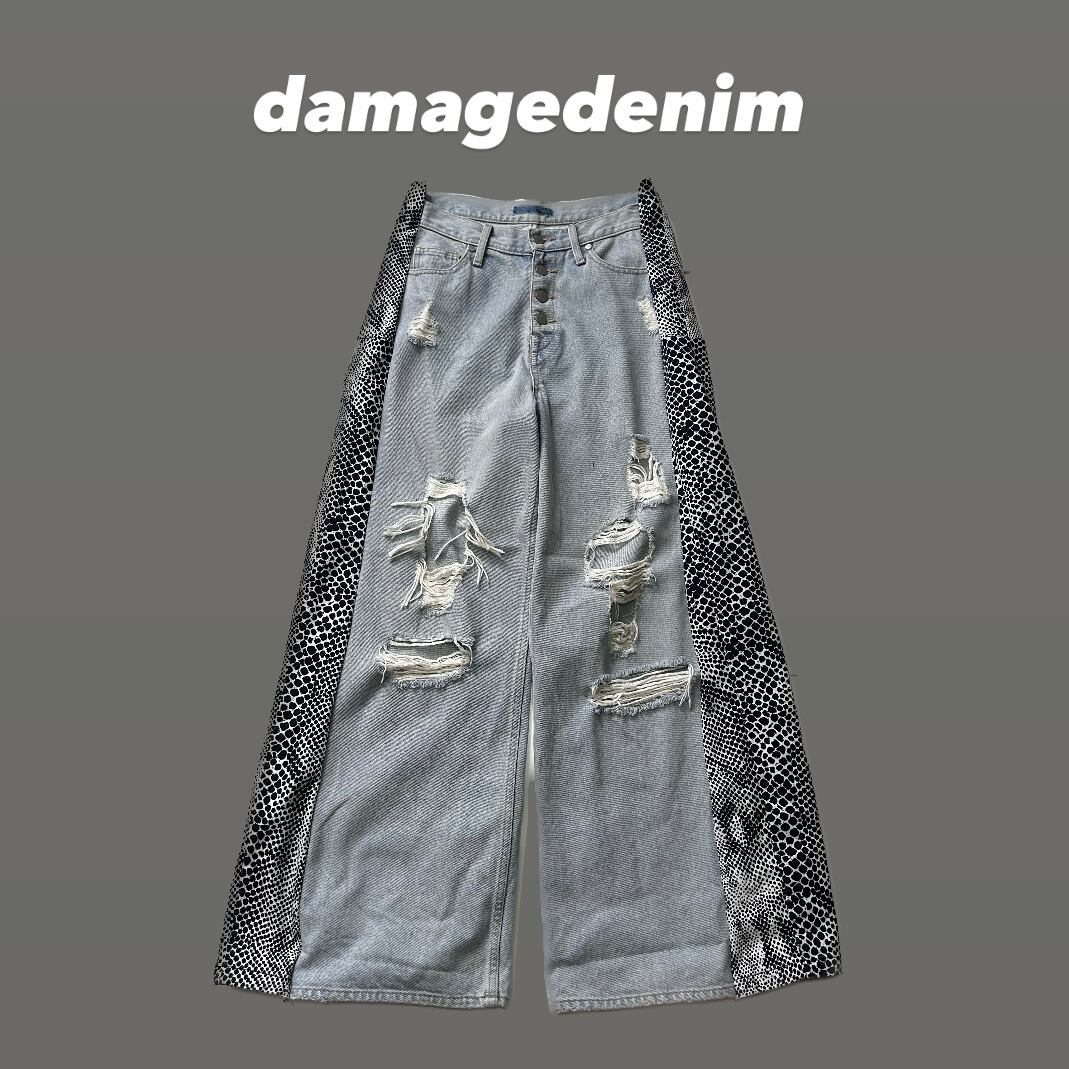 再構築 ドッキング ダメージデニム バギーシルエット サイド柄ライン リメイク