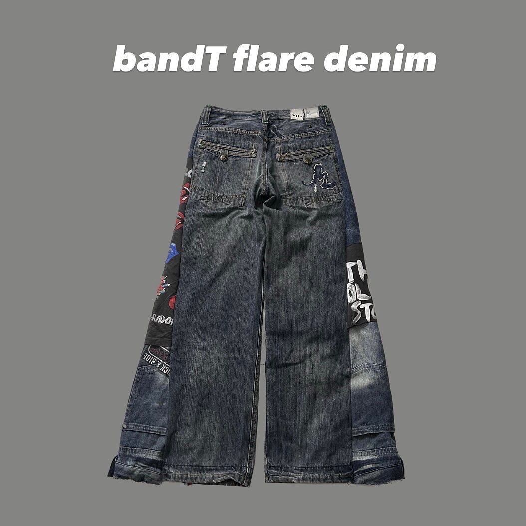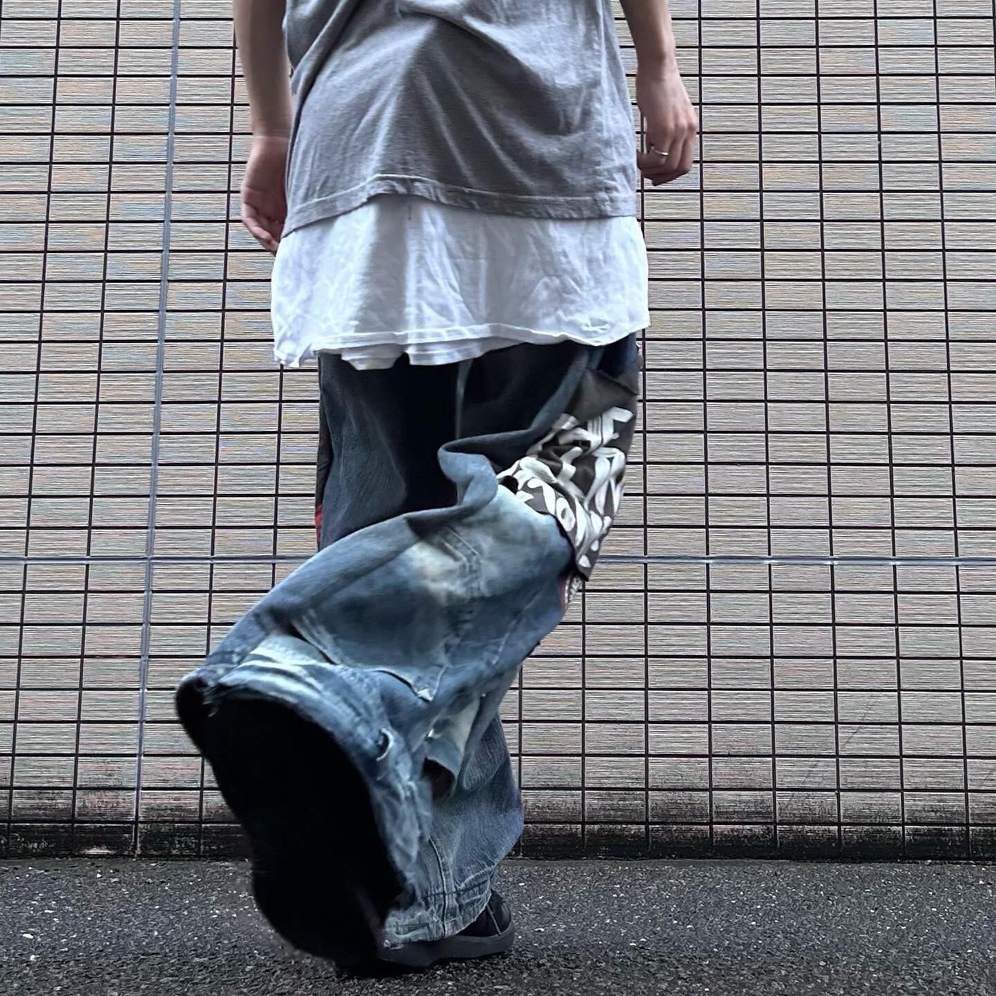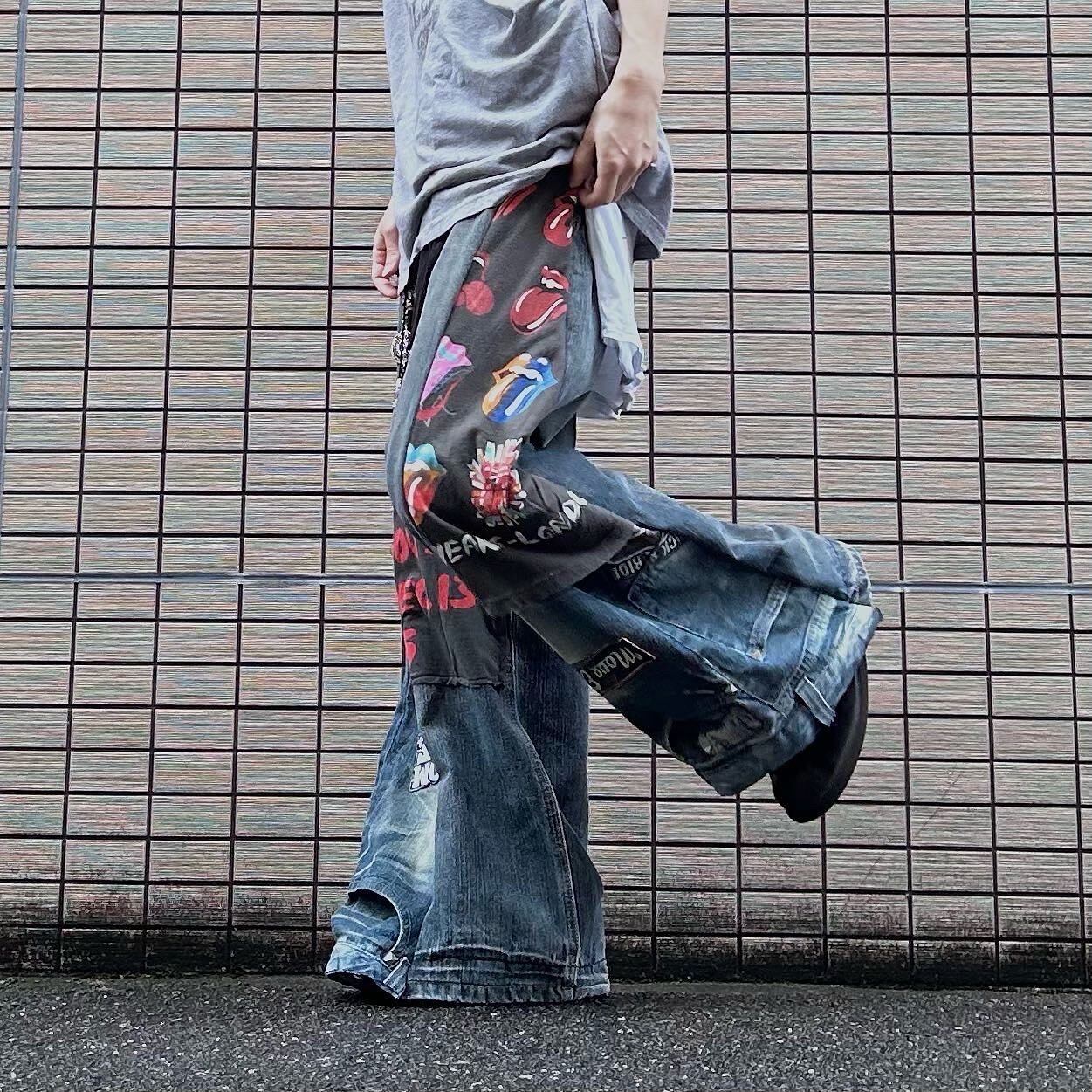 Pant 再構築 ローリングストーンズ ワイドフレアデニム 英文字 スタッズ 切りっぱなし加工