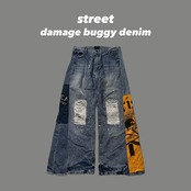再構築されたヴィンテージな雰囲気を持った、ストリートスタイルにぴったりのダメージ加工のストリートバギーデニムです。ペイント加工やドッキングでユニークなデザインを施し、1枚で存在感のあるアイテムに仕上げました。