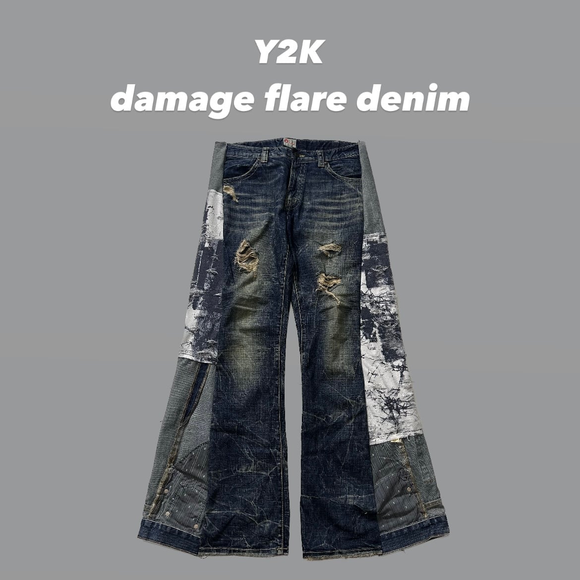 Y2K 再構築 グランジデザイン ワイドフレアデニム リメイク ダメージ加工