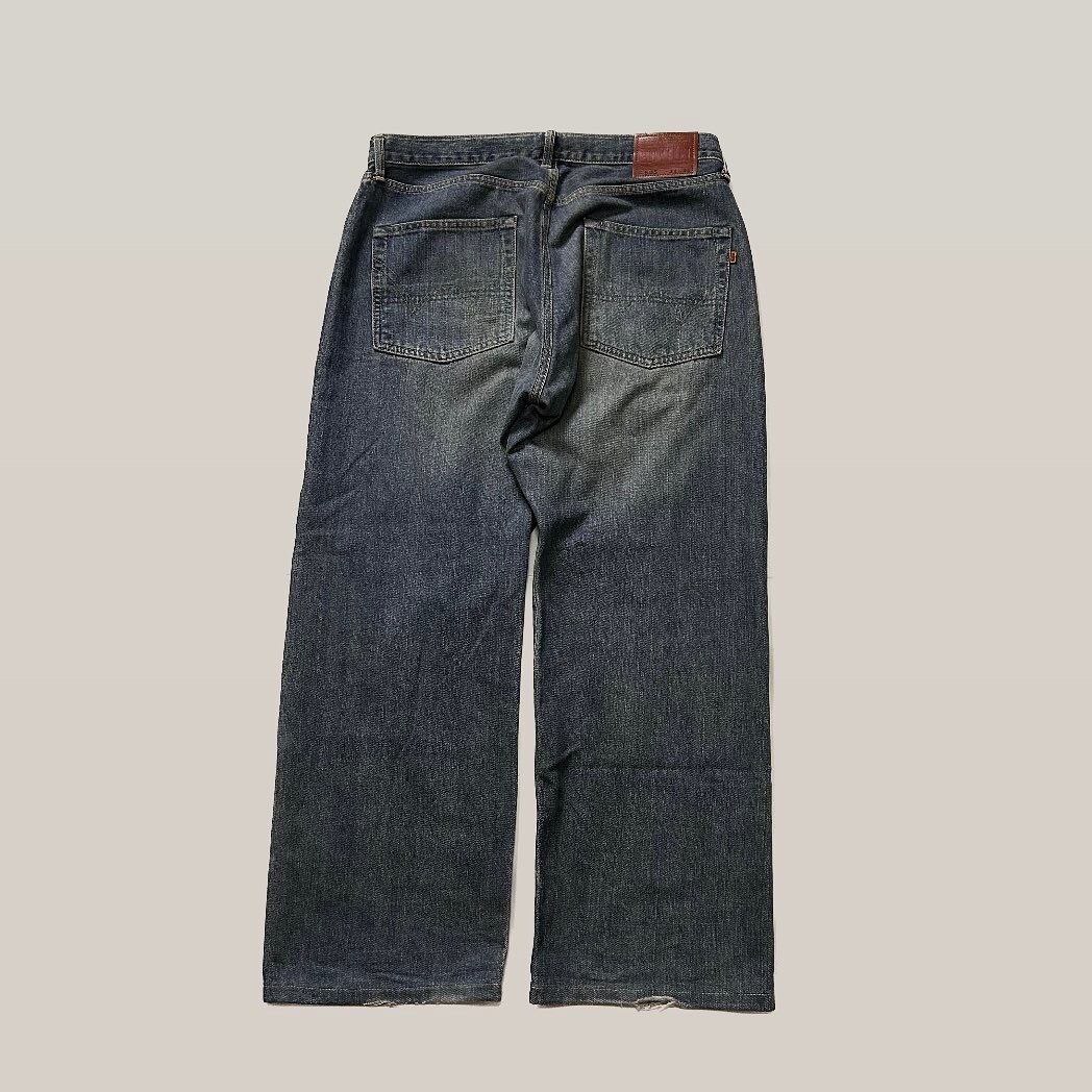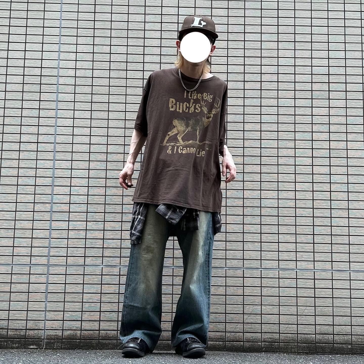 デニムの色落ちに落ち着いたTシャツの雰囲気がマッチしています!腰を落としとダボパンみたいな感じでヒップホップにもきこなせます!