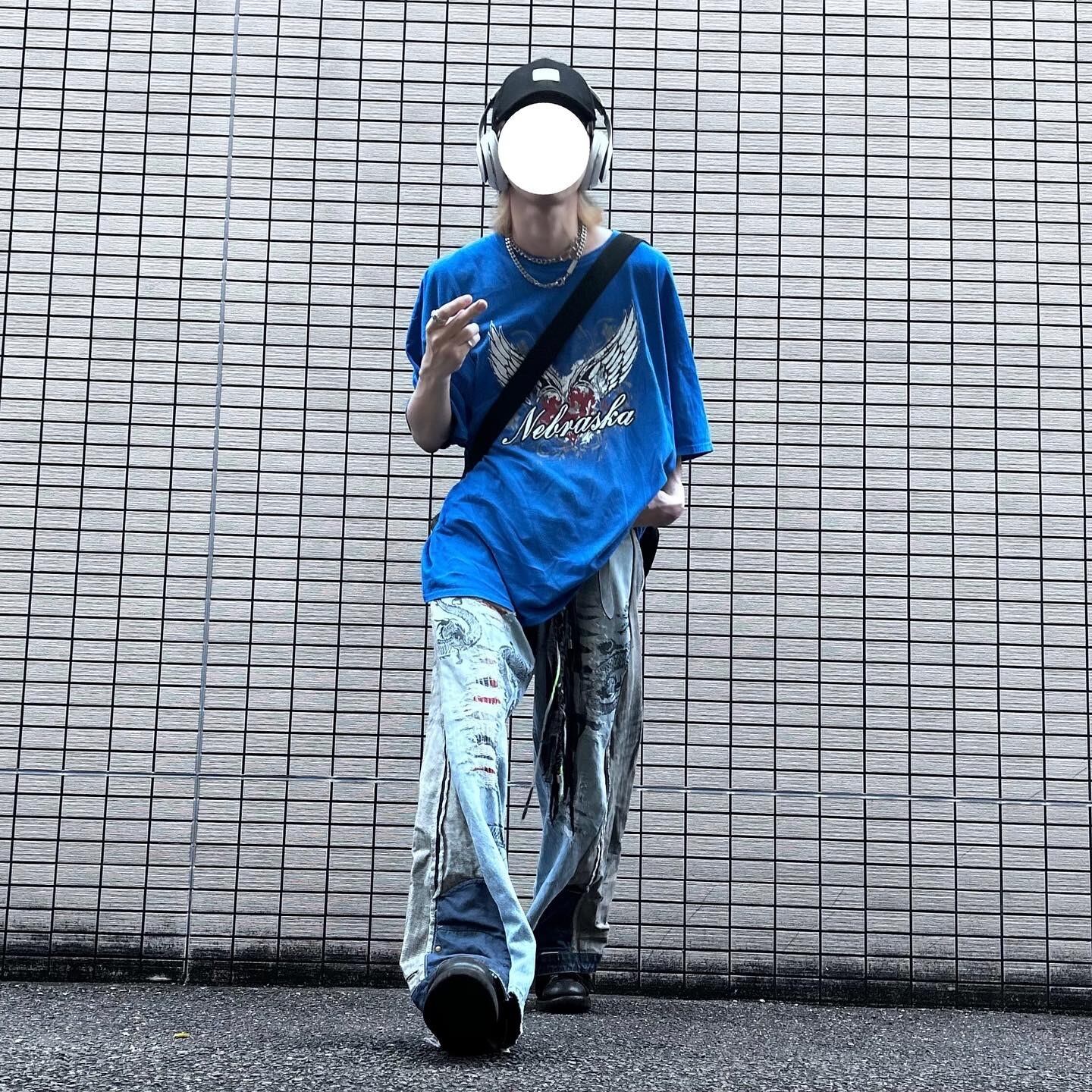 Pant 再構築 ワイドストレートデニム ドラゴンペイント ボロ加工 ダメージ ドッキング