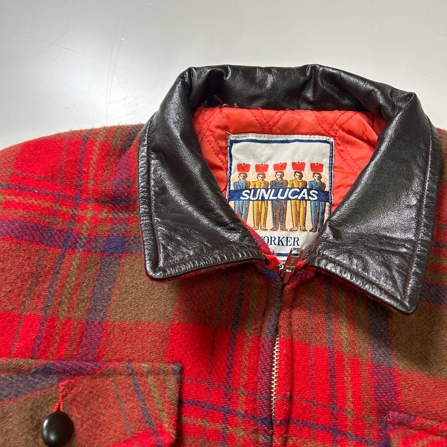 Used 古着 ショート丈ウールチェックブルゾン vintage 90s フェイクレザー襟