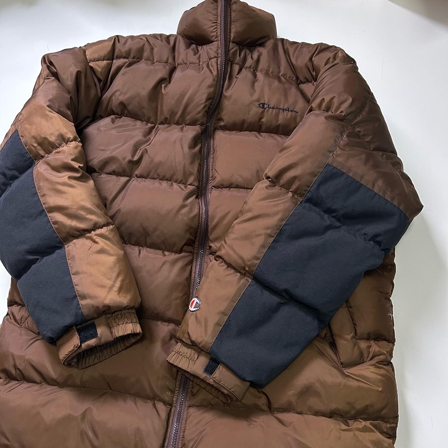 champion デザイン切り替えダウンコート ブラウン ロゴ 極暖