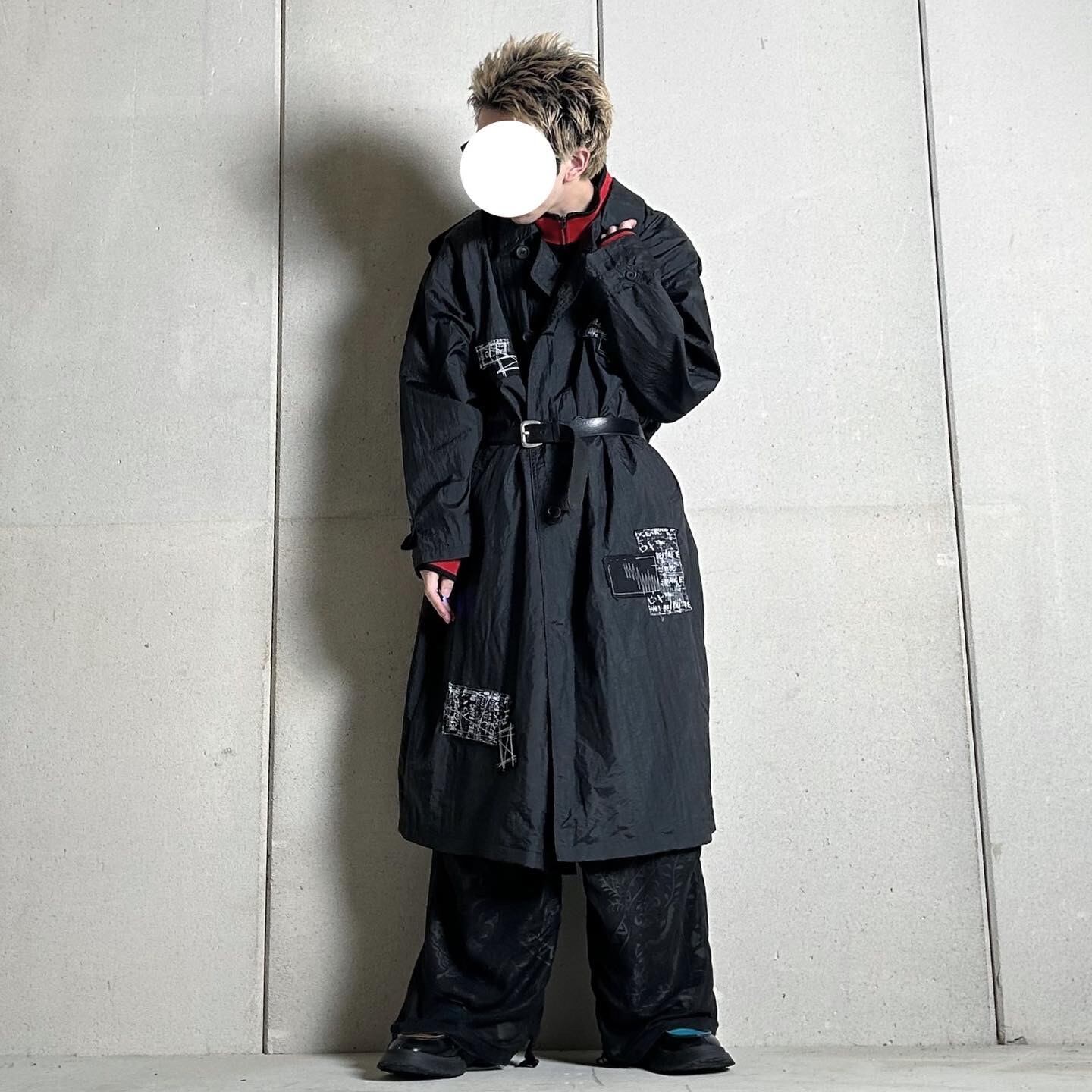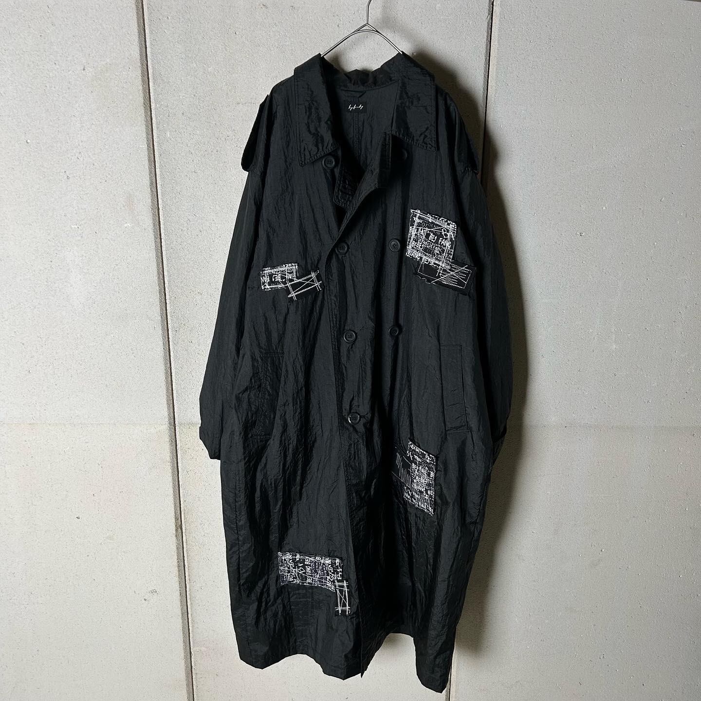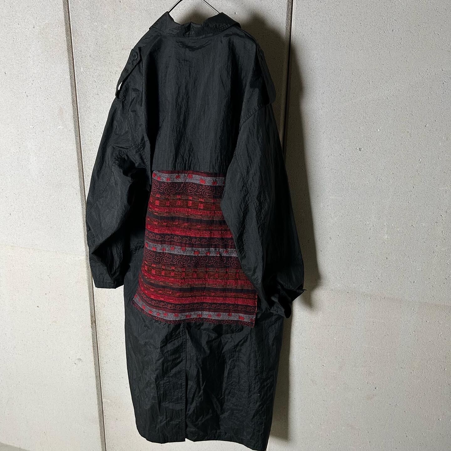 Tops オリジナルリメイク ナイロントレンチダブルコート パッチワークデザイン バックスクエアパッチ