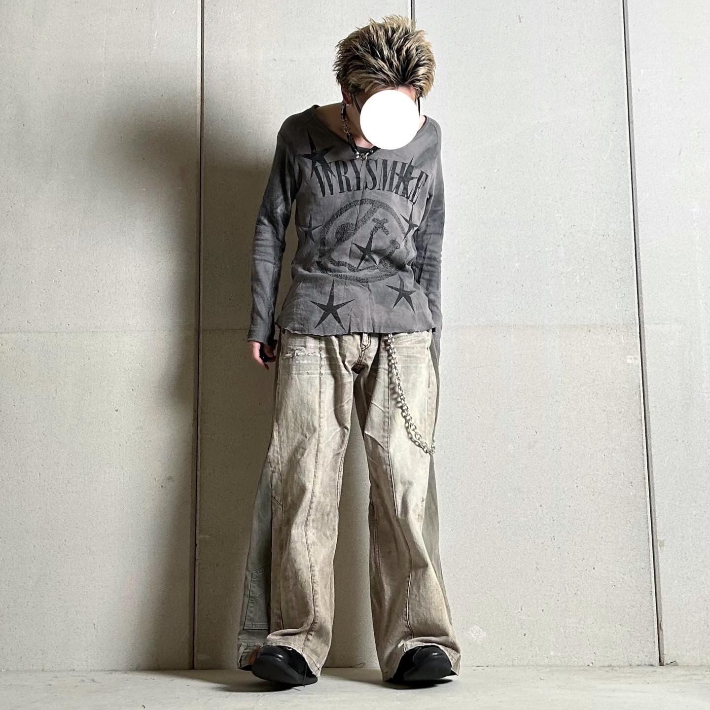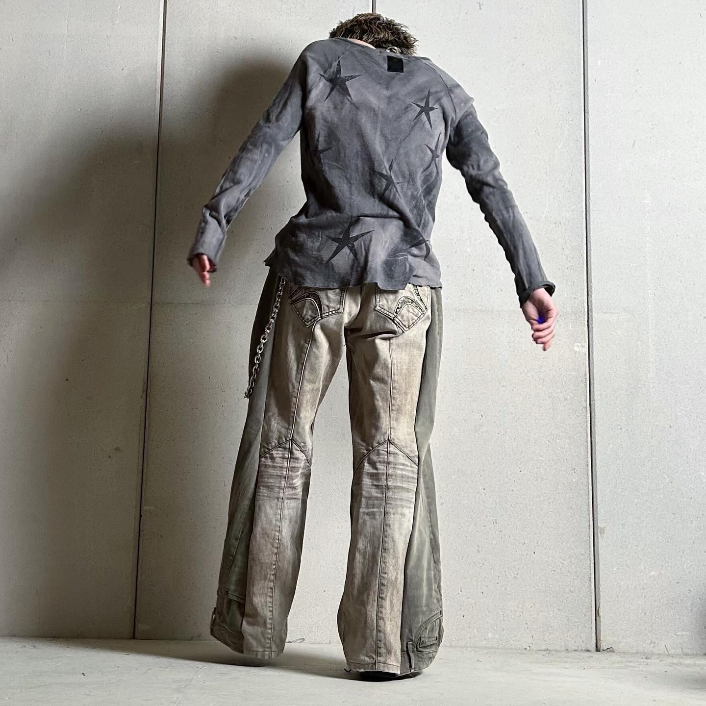 Pants 3moonオリジナルリメイクデニム パイソン柄ポケット ワイドフレアパンツ ウォッシュ加工