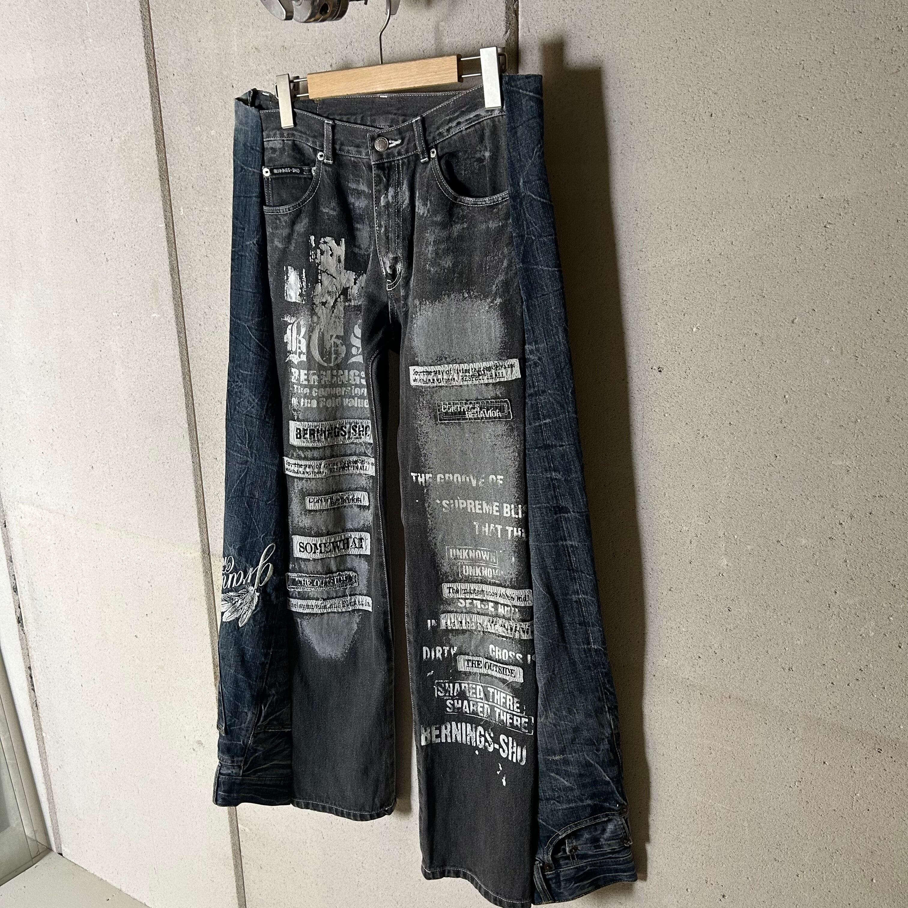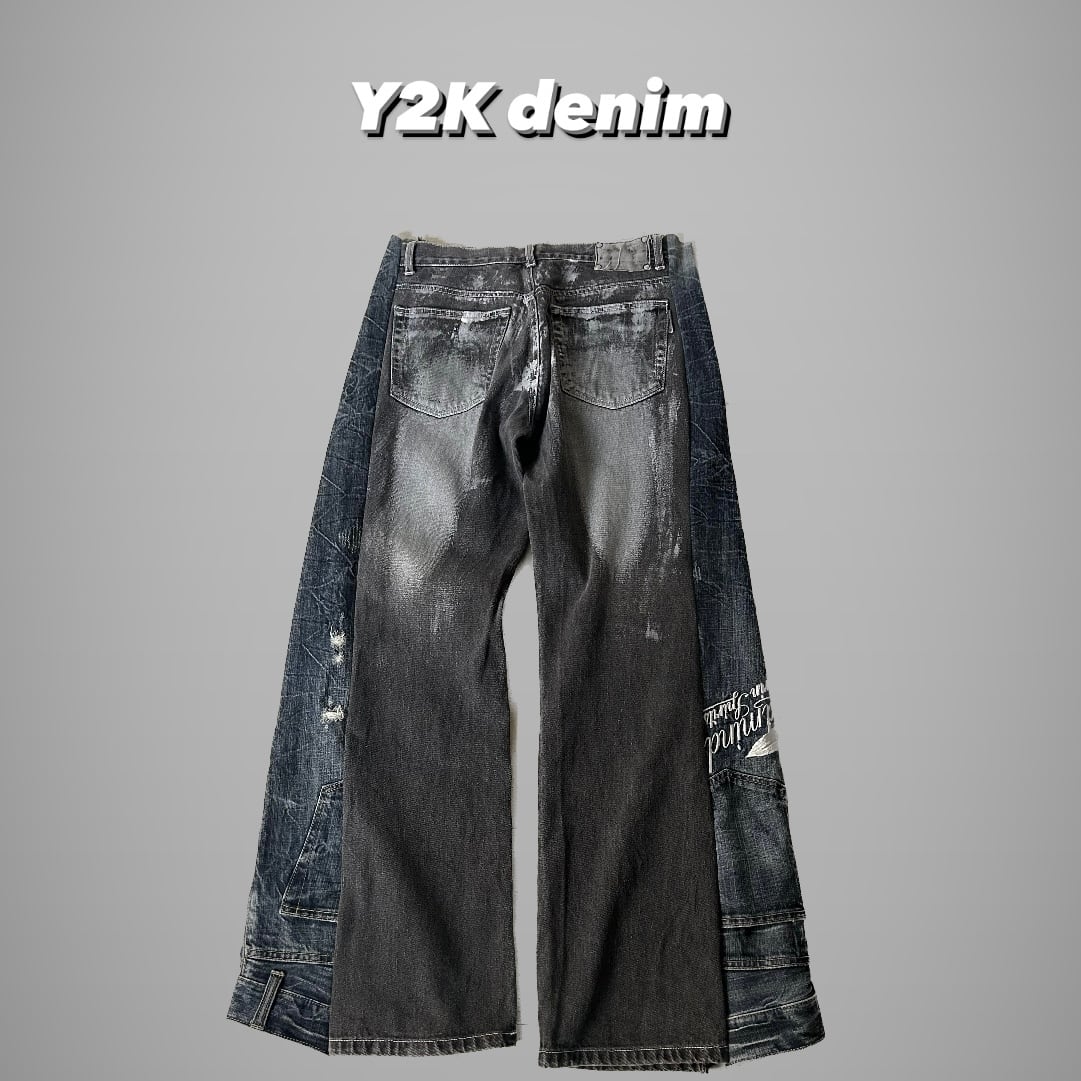 Y2K グランジリメイクフレアデニム ペイント加工 サイド刺繍デザイン ブリーチ加工